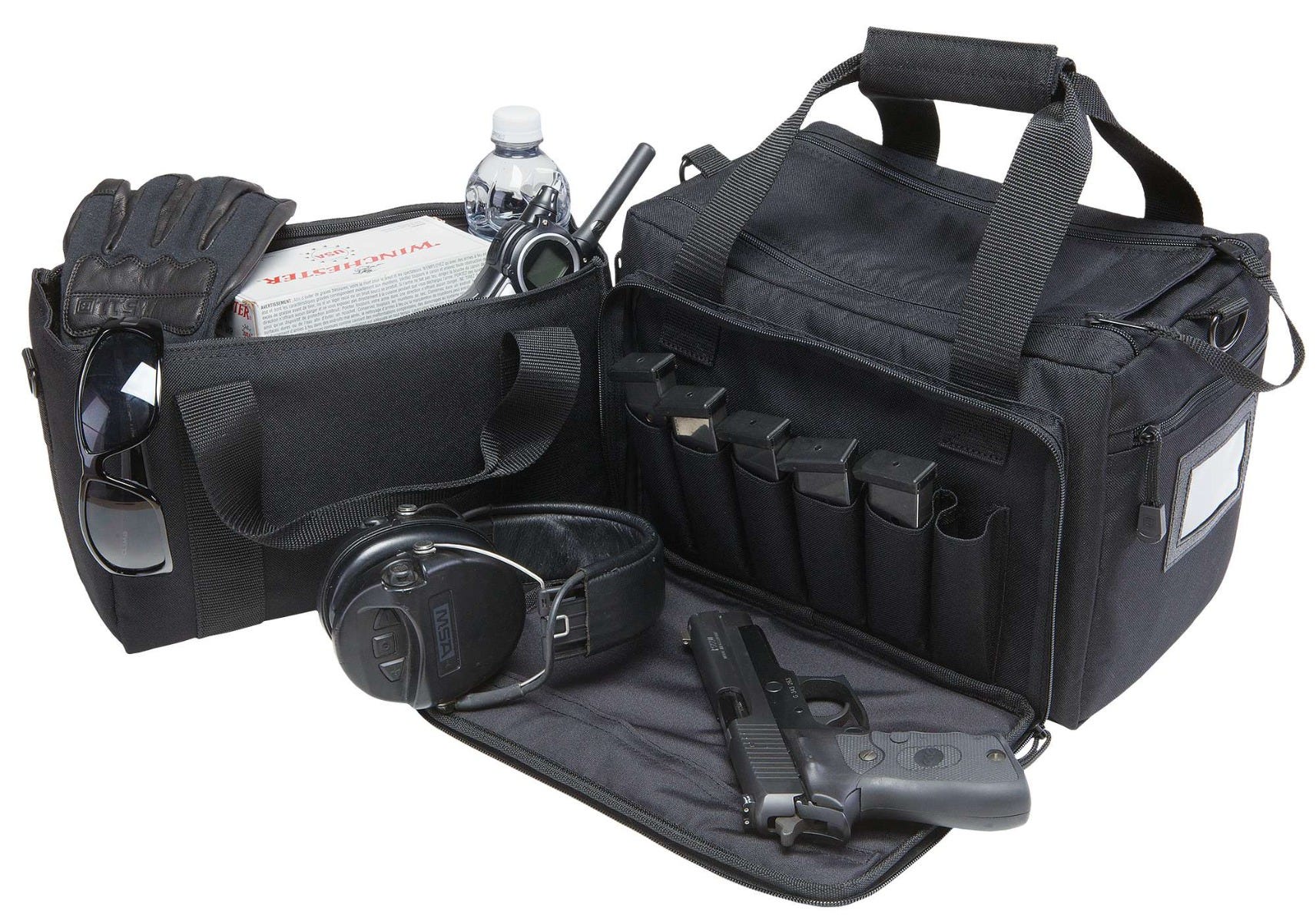 Constructed from durable, all-weather 600D Polyester, the Range Qualifier Bag features separate padded storage for multiple pistols, a zip-down front organizer that effectively stores 8 magazines, side pockets and a removable ammo tote to keep you topped off and for easy cleanup. With a padded should strap, easy-grip handles, and an ID insert, you'll be home on the range in no time.
